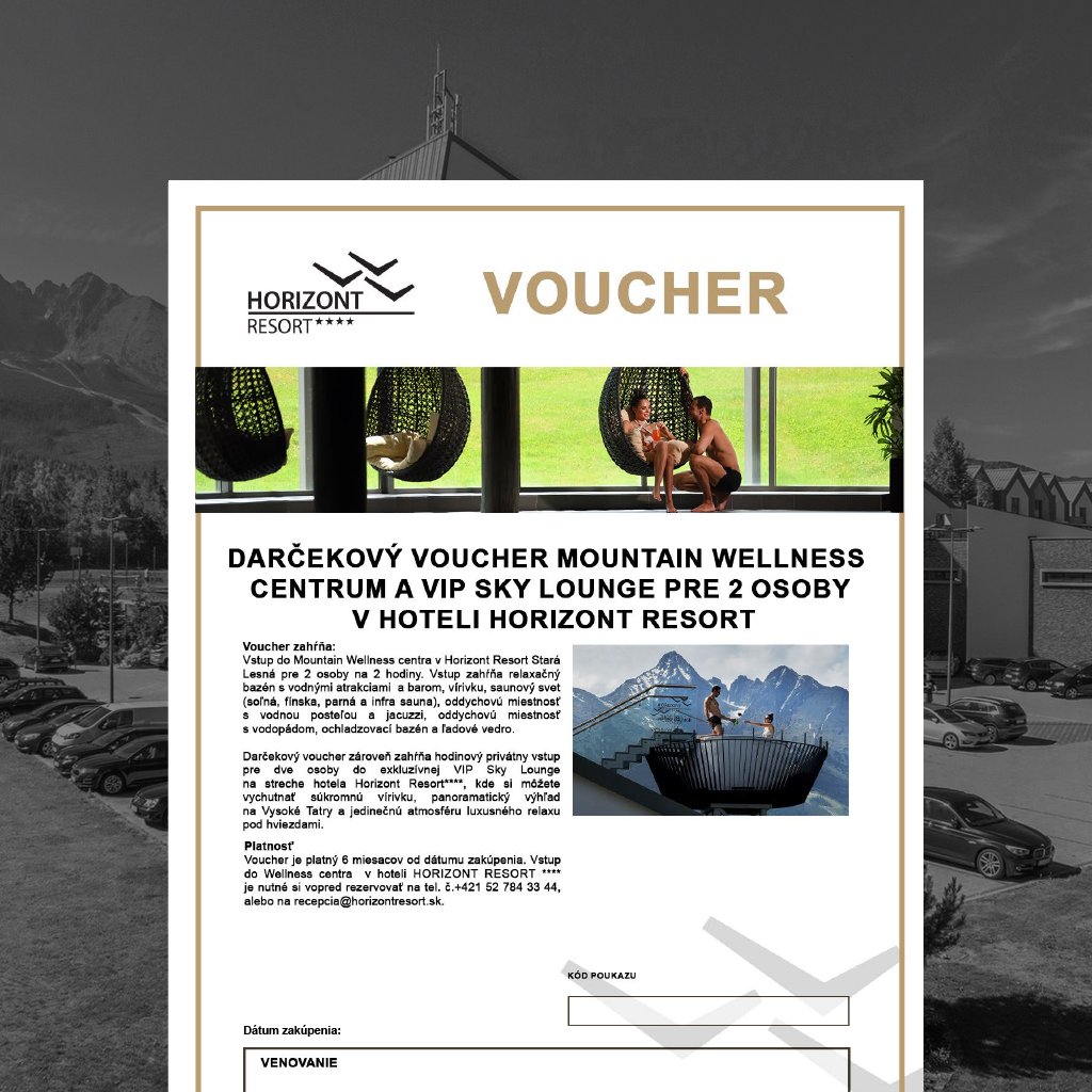 Voucher zahŕňa vstup do Mountain Wellness centra v Hoteli Horizont Resort**** Stará Lesná pre dve osoby, kde si môžete vychutnať relaxačný bazén s vodnými atrakciami a barom, vírivku, saunový svet (soľná, fínska, parná a infra sauna), oddychovú miestnosť s vodnou posteľou a jacuzzi, oddychovú miestnosť s vodopádom, ochladzovací bazén a ľadové vedro. Súčasťou voucheru je aj hodinový privátny vstup pre dve osoby do exkluzívnej VIP Sky Lounge na streche hotela, kde vás čaká súkromná vírivka, panoramatický výhľad na Vysoké Tatry a jedinečná atmosféra luxusného relaxu pod hviezdami. Doprajte si alebo darujte nezabudnuteľný zážitok spájajúci wellness, romantiku a výnimočné prostredie v srdci tatranskej prírody. Voucher je možné využiť len od nedele do štvrtka. Rezervácia vopred je potrebná.