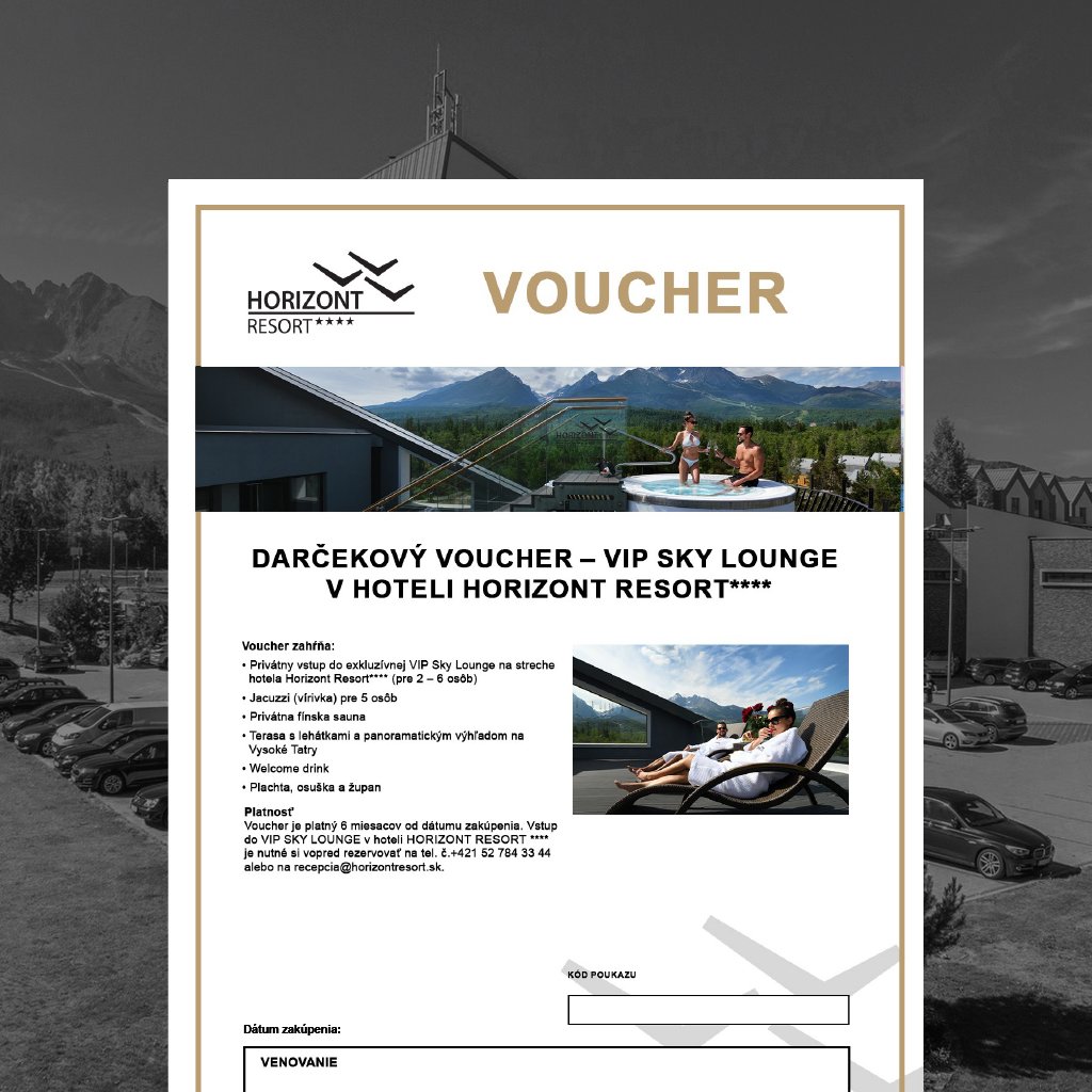 Zabudnite na všetko a vychutnajte si výnimočný večer v privátnej zóne na streche hotela Horizont Resort. Jacuzzi s výhľadom na štíty Tatier, presklená fínska sauna pre 6 osôb, terasa s ležadlami pod hviezdnym nebom a mini kuchynka s ponukou nápojov – dokonalý relax v absolútnom súkromí. Niektoré chvíle si zapamätáte navždy. Toto je jedna z nich.
